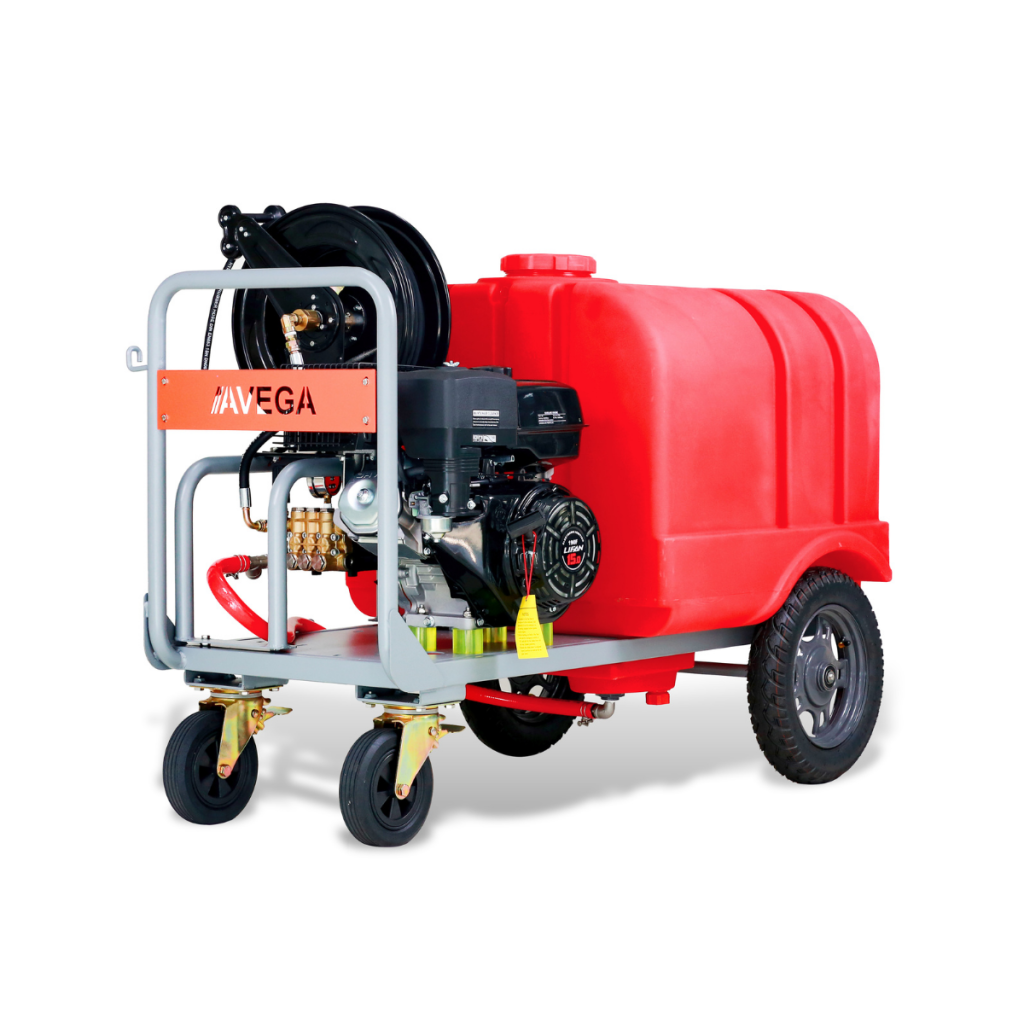 500 litrelik su tankı, 250 bar basınç, hortum sarma makarası ve benzinli motoruyla sistemden tamamen bağımsız, sahra tipi temizlik çözümü.